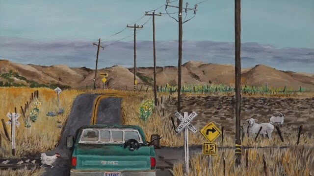 As for painting, she does that in her mother’s garage. She paints landscapes like a storyboard, beginning with what she sees, and then asking herself what she feels. Little by little, she imparts those emotions to the canvas, with color mostly, but with form as well. She stands back from the work and studies it, connecting, waiting, adding, until she knows that it is finished. Certainly, seeing her work, one cannot mistake the passion with which she pursues the rendering.