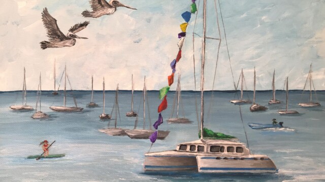 She left her corporate job and started managing logistics for a yacht company. She’d always been drawn to the water and intends some day to sail the world. In the meantime, she began painting the sea, and the boats, and anything that called to her. She also took comfort in art during a particularly stressful period of life, something she has not forgotten and intends some day to share with others.